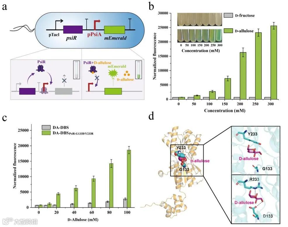 研究团队首先利用特异性响应D-阿洛酮糖的转录调控因子PsiR及其调控的启动子系统搭建了可以检测体系中D-阿洛酮糖含量的生物传感器系统,利用绿色荧光蛋白(mEmerald)作为信号输出模块,将体系中D-阿洛酮糖的含量与宿主菌荧光信号强度相耦联。进一步地,通过设计基于微孔板的筛选策略,该研究对调控因子PsiR进行了功能改造,大大改善了生物传感器系统对D-阿洛酮糖的响应灵敏度。同时,基于结构模型分析,揭示了调控因子改善对D-阿洛酮糖响应灵敏性的分子机理。