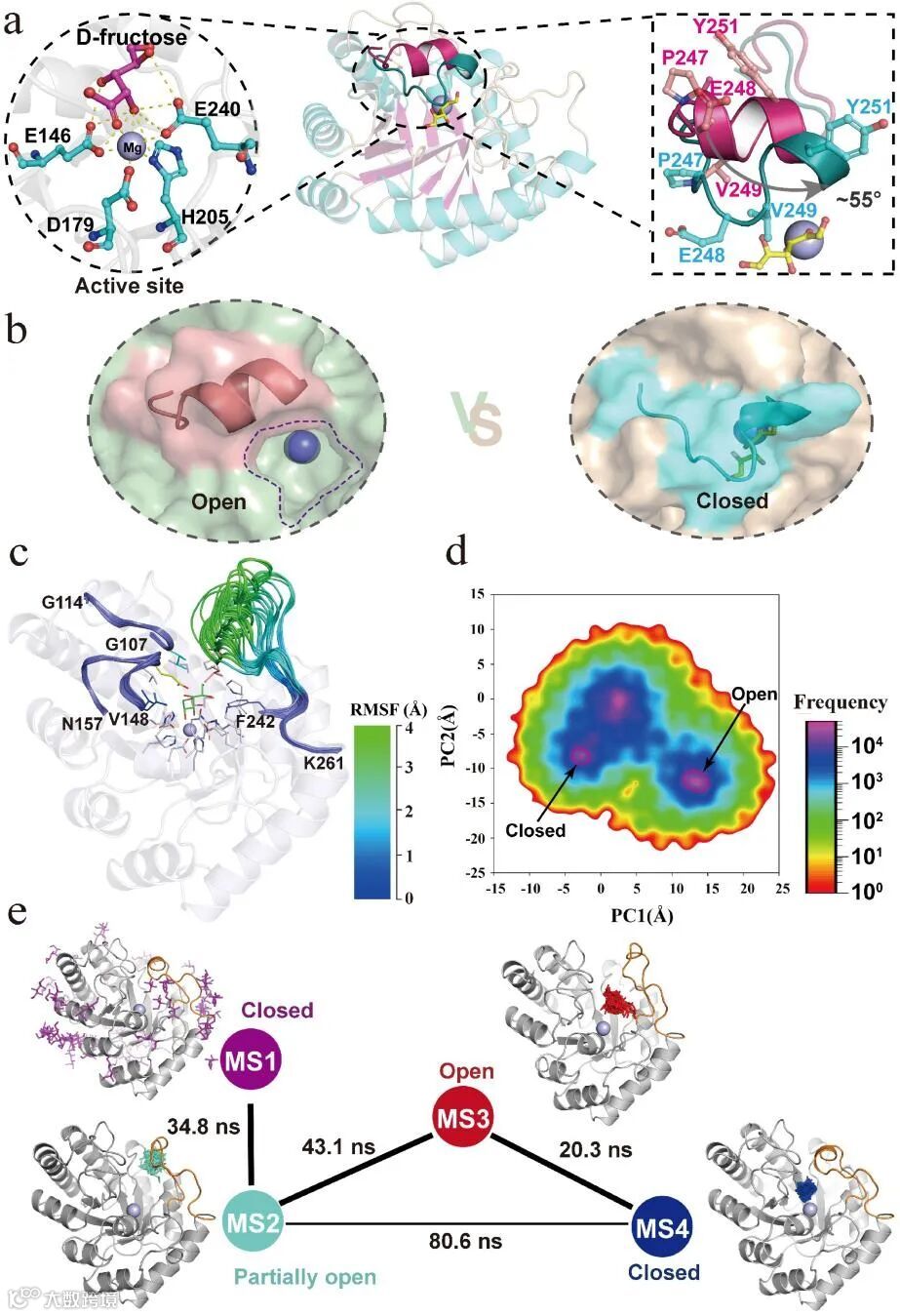 CCBAU 83666的D-阿洛酮糖3-差向异构酶(SfDAE)为研究对象,通过蛋白晶体结构衍射获取酶分子结构信息,鉴定了酶分子催化活性口袋重要氨基酸位点(催化残基、金属离子结合残基等),同时运用结构生物学和分子动力学模拟的方法首次识别了该家族酶位于底物结合口袋处的高灵活性盖子结构,其在底物分子进入酶分子活性口袋的过程中呈现有规律的“打开”和“关闭”两种主要构象,揭示了其在底物进入酶分子活性口袋的过程中发挥着至关重要的调控作用。
