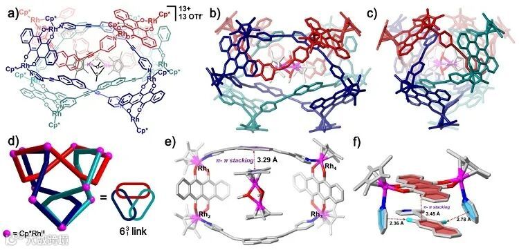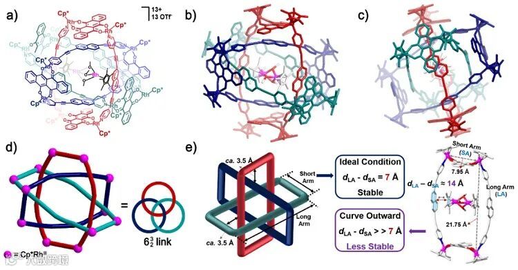 图2. 有机金属分子Borromean环在固体状态下的分子结构表征:a)分子结构示意图;b)和c)晶体结构图;d)晶体结构简化图;e)结构局部分析对比图。图片来源:
