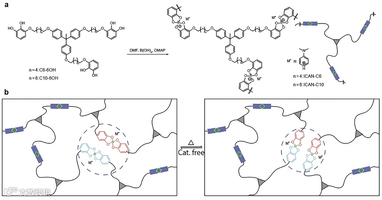 利用螺硼酸酯化学反应,成功合成了首例由带负电的骨架结构组成的离子型共价自适应网络