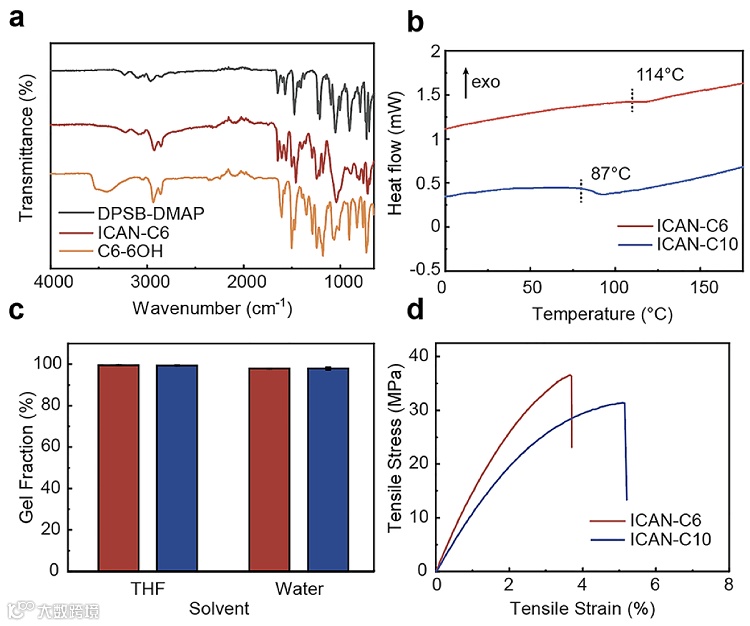 碳链的前驱体,以其为原料和硼酸进行缩合,得到了两种离子型共价自适应网络。FTIR证实了得到的材料中不存在未反应的羟基,且材料在多种有机溶剂中均不溶解或溶胀,表明了它们高度交联的特性。由于具有更长的柔性碳链,ICAN-C10更柔软且具有更低的玻璃态转变温度。ICAN-C6则具有更高的机械强度和较高的玻璃态转变温度。