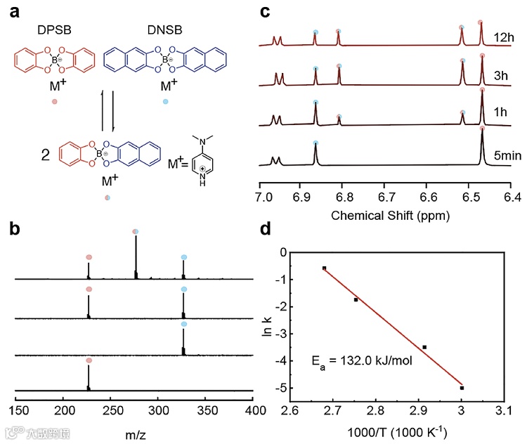 下监测反应,利用阿伦尼乌斯公式计算得到反应活化能为132.0 kJ/mol,表明该反应的速率对温度变化十分敏感。随后,团队合成了两个具有不同