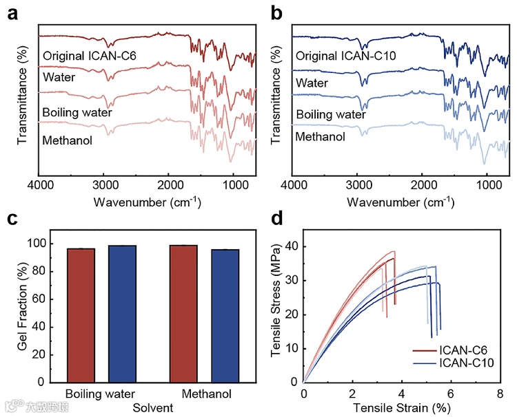 此前基于硼化学制备的CANs主要使用硼酸酯和硼氧烷作为动态共价连接,但这两类化合物在水或醇的存在下容易分解,温度升高亦能加速这一进程。与之相反,该团队发现由螺硼酸酯构建的ICAN在甲醇和水,甚至是沸腾的水中,都展示出了优异的稳定性。分别在常温水中浸泡一星期,沸水中浸泡24小时,甲醇中浸泡48小时后,ICAN-C6和ICAN-C10均保留了原有的机械性能。