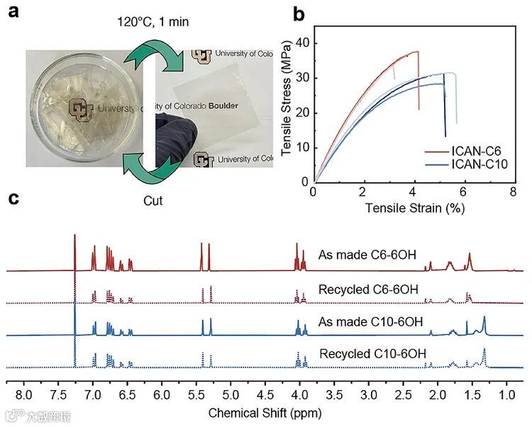 为了测试ICAN的可再加工性,团队将切碎的ICAN-C10样品在120 °C下5 MPa下热压。在1分钟内成功获得了均匀的无表面缺陷的透明膜。ICAN-C6亦具有相似的性质。在连续两次再加工后,ICANs原有的机械性能仍得以保留。而后,团队对材料的回收性进行了研究,发现ICANs在稀盐酸和乙酸乙酯的溶液中可以高效的降解为多酚前驱体,在简单的萃取后可以高于95%的收率回收。回收与合成的多酚单体具有一致的核磁共振谱,证明ICANs的闭环可回收性。