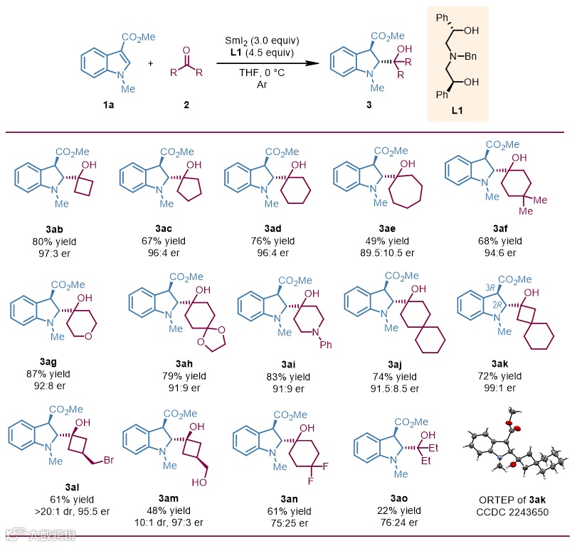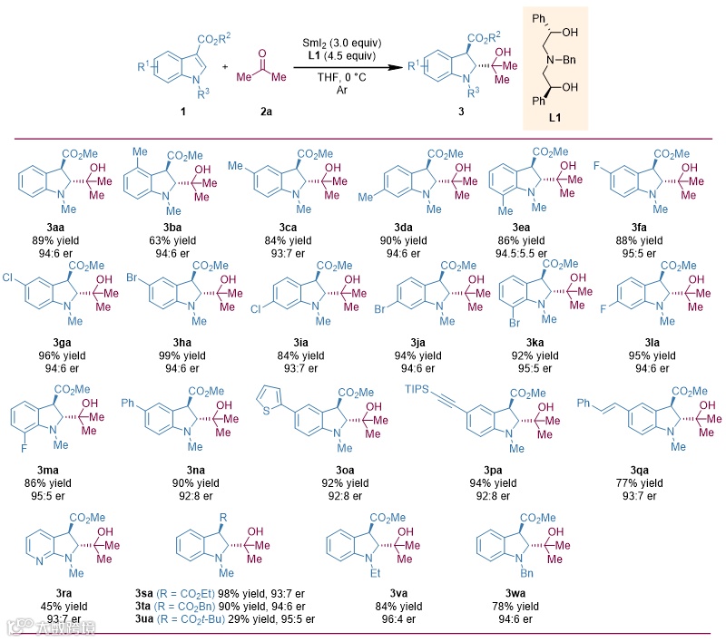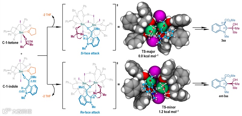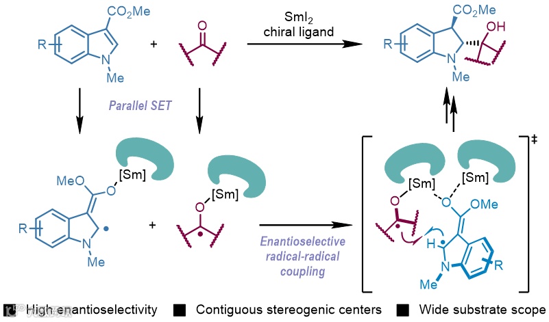 自从1977年二碘化钐(SmI2)被法国科学家Kagan引入有机合成领域以来,二碘化钐已发展为最常用的单电子还原剂之一,其介导的还原偶联反应是构建碳-碳键的重要方法。该类反应有两种常见的机理假设(图1)。其一是二碘化钐首先与羰基配位并发生单电子转移,所形成的羰基自由基与烯烃、α,β不饱和烯烃以及芳环发生偶联反应(carbonyl first mechanism)。此外二碘化钐还可能先与α,β不饱和烯烃发生单电子转移,再与另一分子酮进行偶联(olefin first mechanism)。当体系中存在过量的二碘化钐时,其是否可以分别与两种底物发生单电子还原,进而通过自由基-自由基偶联过程形成碳-碳键,这是在二碘化钐化学中未被证实的反应模式。