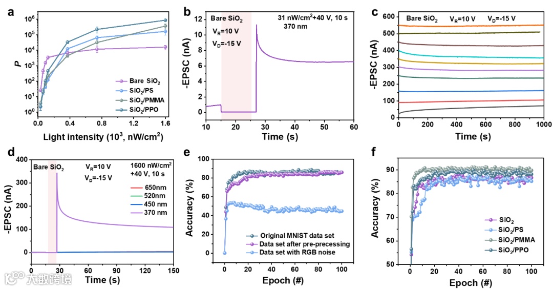 器件的EPSC。(e)有/无神经形态预处理下,模式识别的精度。(f)具有不同缓冲层器件的模式识别精度。