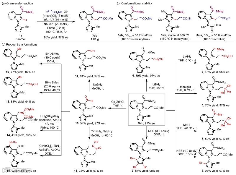 反应可以实现克级规模放大,对产物消旋化能垒测试表明这类化合物具有较好的轴手性稳定性。随后作者对产物进行了转化实验,产物可以顺利进行如溴代、内酰胺化等多样转化,为快速获得结构多样的N-N轴手性联芳基化合物提供了可能(图3)。