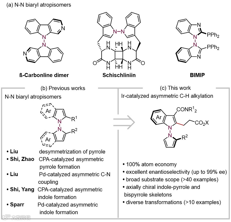 N-N轴手性的联芳基骨架广泛存在于天然产物、生物活性分子和手性配体中,因而受到化学家的关注(图1a)。然而相较于被广泛研究的C-C及C-N轴手性化合物,利用不对称催化来实现N-N轴手性化合物的高对映选择性合成研究起步较晚,自2021年起才开始有陆续报道(