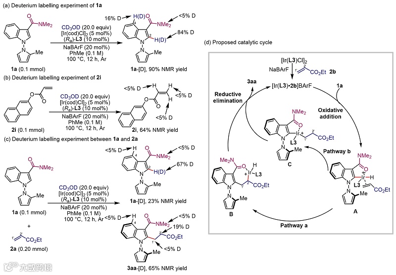 作者通过氘代实验证明反应是通过催化剂对N-N轴联芳基底物的C-H键活化启动的,后续反应经过丙烯酸酯的迁移插入和还原消除得到目标产物(图4)。