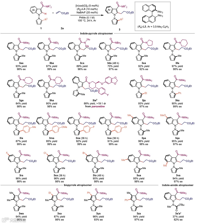 在最优条件下,作者对N-N轴联芳基底物与丙烯酸酯底物的普适性进行了考察(图2)。结果表明,反应对于吲哚-吡咯联芳基底物和双吡咯联芳基底物都能得到良好到优秀的收率和对映选择性控制(最高98%收率,99% ee),并且丙烯酸酯底物同样具有很好的兼容性,以高对映选择性得到目标烷基化产物。