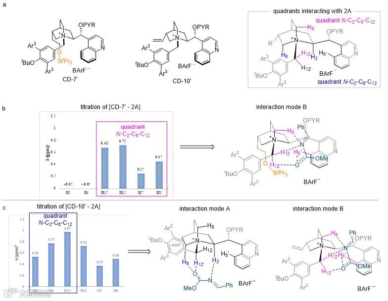 发生相互作用 (图4b),因此提高了反应的区域选择性。这些催化机理研究不仅揭示了季铵盐相转移催化剂与亲电试剂具有氢键作用,而且展示了对该作用的调控对催化剂性能的开发和提升具有重要意义。这些有关催化机理的新认知对于手性相转移催化的开发和理性设计具有指导意义。