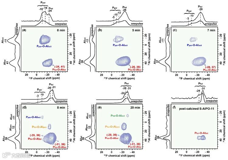 作者采用多核多维固体核磁共振等表征手段研究了Al和P配位环境和连接性的变化。初始前驱体已经具有P-O-Al互相连接的网状结构(图3a);随着反应时间的延长,P和Al物种发生了进一步缩合反应,但晶化完成时仍存在少量的