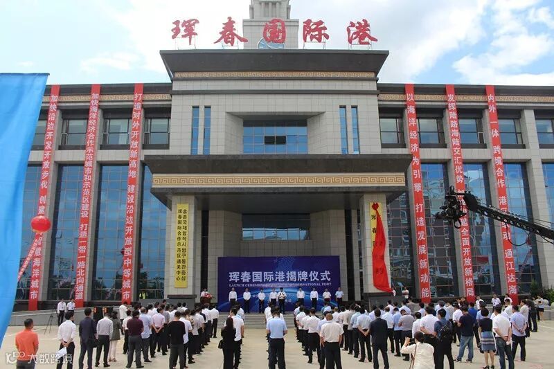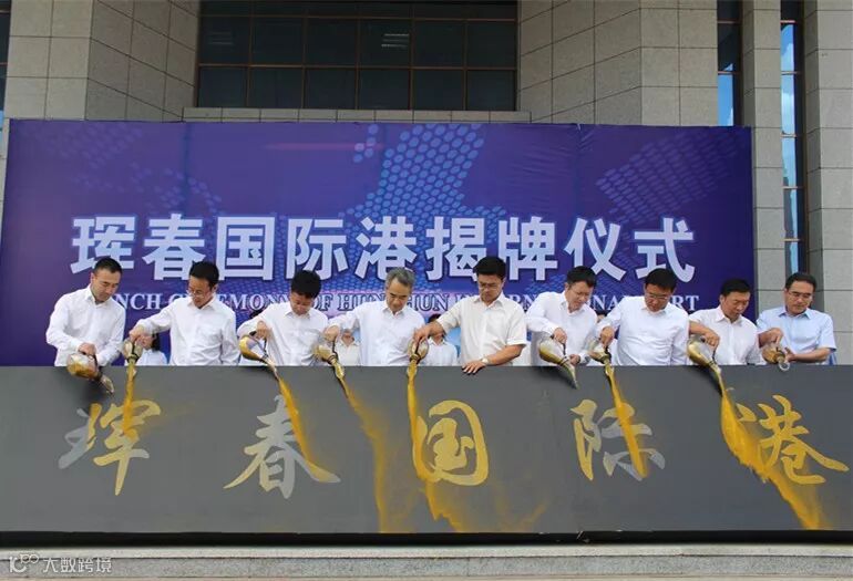 浙江省发展和改革委员会副主任、吉林省人民政府副秘书长(挂职)吴胜丰,吉林省延边州委常委、副州长娄国闻,宁波舟山港股份有限公司副总经理、党委委员江涛出席仪式并致辞。珲春市委副书记、市长张吉锋主持揭牌仪式。吴胜丰、娄国闻、张吉锋、江涛等一同抛撒鎏金沙,共同庆祝珲春国际港揭牌。