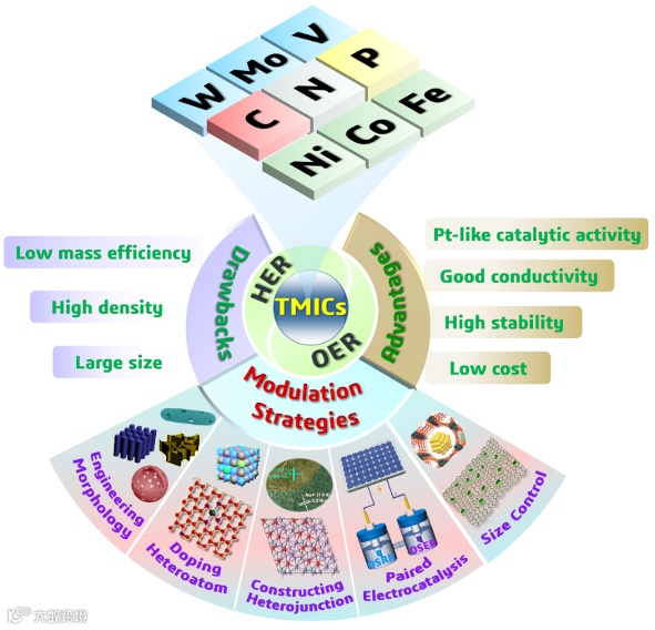 近日,黑龙江大学付宏刚教授团队的AMR述评文章“Structure Engineering and Electronic Modulation of Transition Metal Interstitial Compounds for Electrocatalytic Water Splitting”在线发表。文章重点讨论了过渡金属间隙化合物在电催化分解水领域的最新研究进展,总结了包括尺寸控制、形貌工程、杂原子掺杂、异质结构建等一系列性能调控策略,并初步探讨了基于水循环的配对电催化体系;最后,文章对该领域面临的挑战和未来发展方向进行了总结与展望。