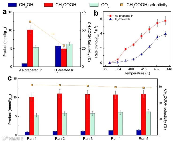 ),乙酸将会是主要产物。鉴于此,王敦伟团队使用了温和氢气还原的方法将铱金属中心由IV价还原为III价,价态的变化由X射线光电子能谱以及X射线吸收谱进行检测。EXAFS表征结果说明在该还原过程中,锚定的铱配合物催化剂结构基本保持不变;与此同时,铱价态变化前后,甲烷氧化的总体产率基本保持不变,因此可以推断铱价态的变化并未对甲烷或者是氧气的吸附和活化产生影响,而是主要调节了铱金属中心对于一氧化碳的配位能力。另外,该催化剂(