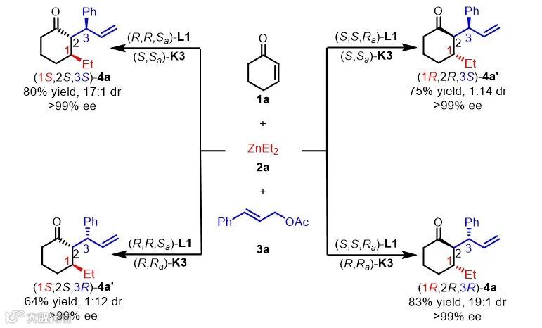 当分别使用不同构型的铜催化剂和铱催化剂时,反应能够从相同的起始原料出发,合成四种立体异构体中的一种,实现非相邻手性中心(1,3-位置)的立体发散性合成(图3)。反应均能取得良好到优秀的收率、非对映选择性和对映选择性控制。值得注意的是,在此反应中,铜催化剂决定了产物C1位的手性中心,铱催化剂决定了产物C3位的手性中心,而产物C2位的手性中心始终与C1位的手性中心相反。