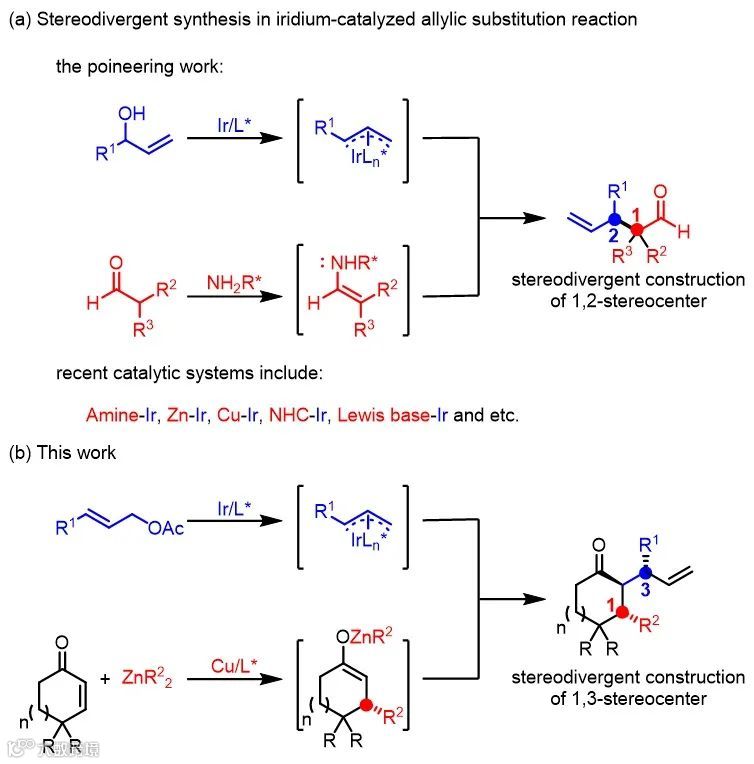 金属铱催化的烯丙基取代反应已成为立体选择性地构建碳-碳键或碳-杂键的重要方法之一,反应往往能取得高的区域选择性和对映选择性控制。在单一的铱催化体系当中,潜手性亲核试剂能够生成含相邻双手性中心的化合物,但反应的非对映选择性控制相对较难,并且很难得到所有的立体异构体。协同催化模式为这些问题提供了一种新的解决思路。2013年,Carreira课题组将有机小分子催化体系与铱催化的烯丙基取代反应结合,成功实现了醛类化合物α位的不对称烯丙基取代反应(