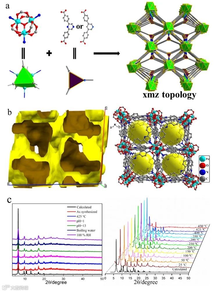 挑战,根据以下的原则进行了吸附剂材料的设计:(i)高稳定性吸附剂,特别是具有高耐水性的吸附剂对于湿度条件下的气体分离应用是必不可少的。因此作者选择三核Fe簇作为吸附剂的构建单元。(ii)为了实现乙烷的优先吸附和增强材料疏水性,需要设计不含有不饱和金属位点的吸附剂。吡啶/吡嗪的氮原子与Fe簇轴向配位,可以消除不饱和金属位点。(iii)优选电中性框架以防止抗衡离子堵塞孔隙。三核铁簇存在