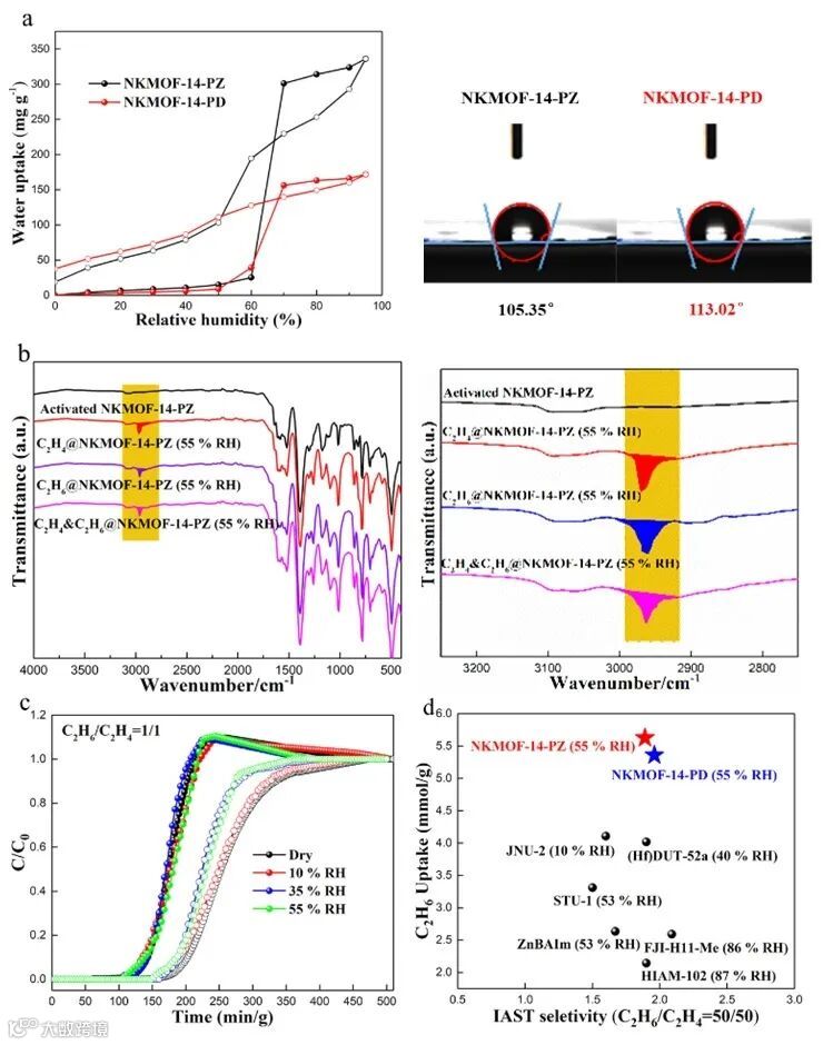 图3. a) NKMOF-14的水蒸气吸附数据和亲疏水角;b) NKMOF-14在不同湿度条件下选择吸附乙烷的红外数据;c) NKMOF-14湿态下的混合气体穿透实验结果以及与已报道材料性能对比图