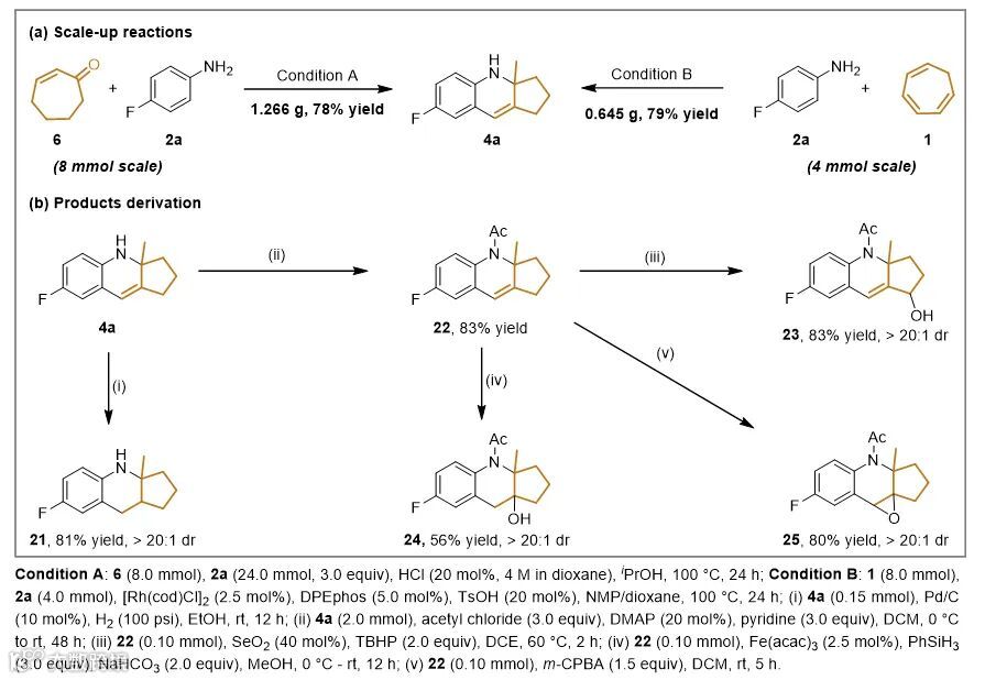 最后,作者对反应的应用性进行了探索(图5)。放大量实验表明,无论是铑/酸催化策略还是酸催化反应体系,反应在规模放大后均未对目标产物的收率造成明显的影响。接下来,作者对模型产物