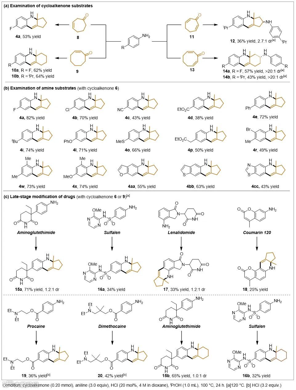 图4. 酸催化的底物范围及与芳胺药物的后修饰