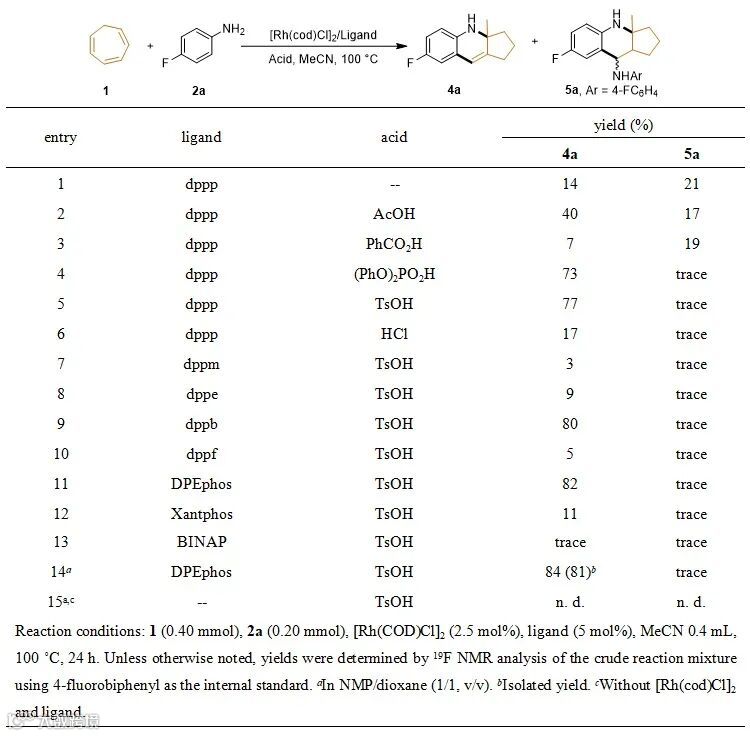 作为模板底物,考察并优化酸、配体及溶剂等反应影响因素,进而得到最优的反应条件为:[Rh(cod)Cl