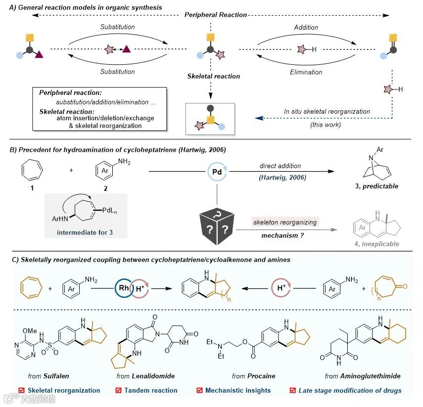 开发复杂有机化合物的高效制备方法是合成化学家的不懈追求,这对于推动天然产物全合成、药物开发、材料科学以及化学工业等领域的发展都具有重要的作用。传统上,基于对反应底物和合成路线的精心设计,通过取代、加成、消除或重排等基元反应,可以实现官能团的逐步转化。与之相比,利用已有化合物的环状分子骨架,在交叉偶联反应过程中实现分子骨架重构和后修饰反应,则可以为复杂化合物的制备提供一个新的思路(图1A)。