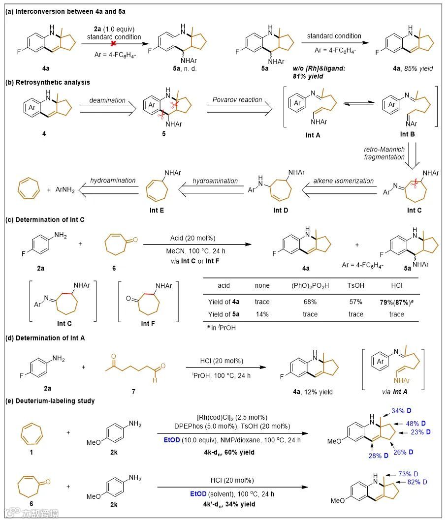 通过酸促进的脱胺化反应生成(图3a)。基于此,作者对反应机理进行了分析,认为该反应有可能先后经历了连续氢胺化、逆-Mannich开环以及随后的Povarov环化反应,实现碳环骨架结构重塑的过程(图3b)。随后,作者开展了一系列机理验证实验,证明上述推测机理的合理性。首先,考虑到中间体