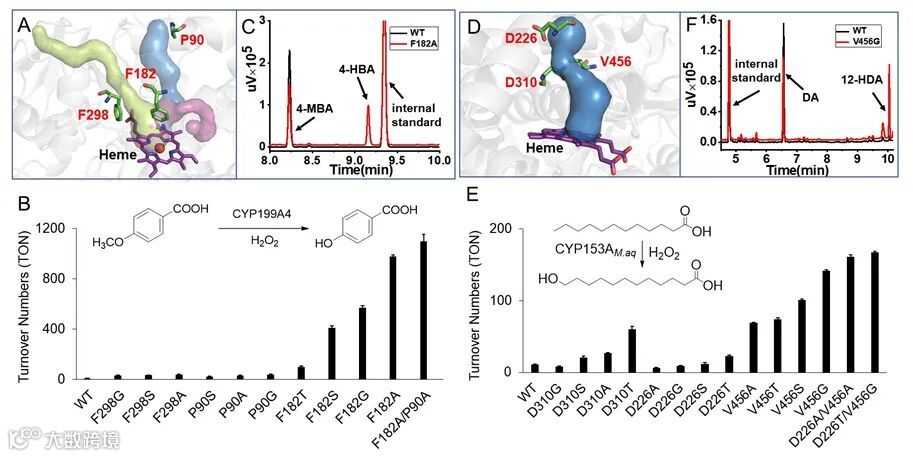流入活性中心的隧道入口或瓶颈处的关键氨基酸,结合定点突变和多轮反应筛选,成功将CYP199A4和CYP153