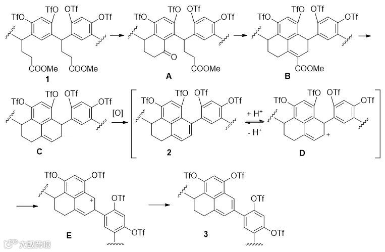 首先通过分子内的傅克酰基化反应生成化合物A,随后发生克莱森缩合反应得到化合物B,接着发生水解与脱羧反应生成化合物C,伴随着化合物C的氧化芳构化会生成化合物
