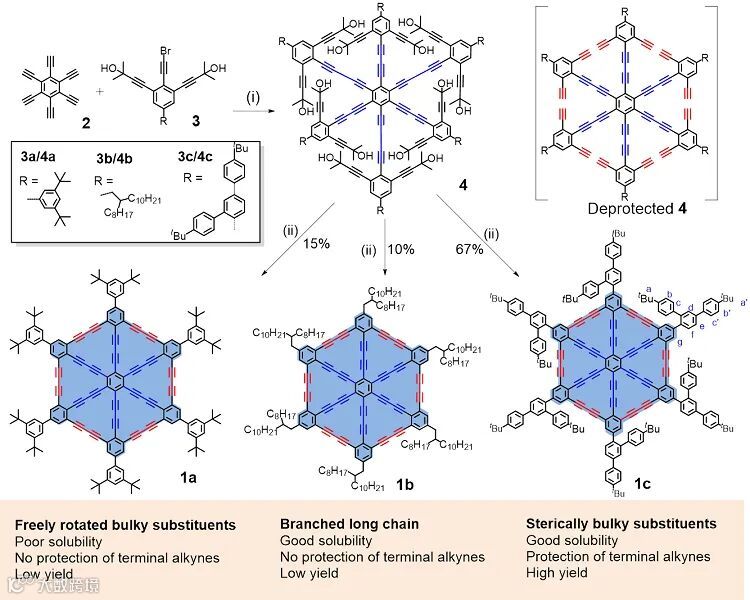 (图1)。支链长链可以提高naoGDY的溶解度,而由于末端炔烃的分子间偶联,分子间聚合副反应不可避免。而3,5-二叔丁基苯取代基的引入,额外的苯环增加了中心纳米石墨炔核的π-共轭表面,进一步增加π-π堆积的趋势,因此外部叔丁基不能满足溶解度要求。因此,他们最终
