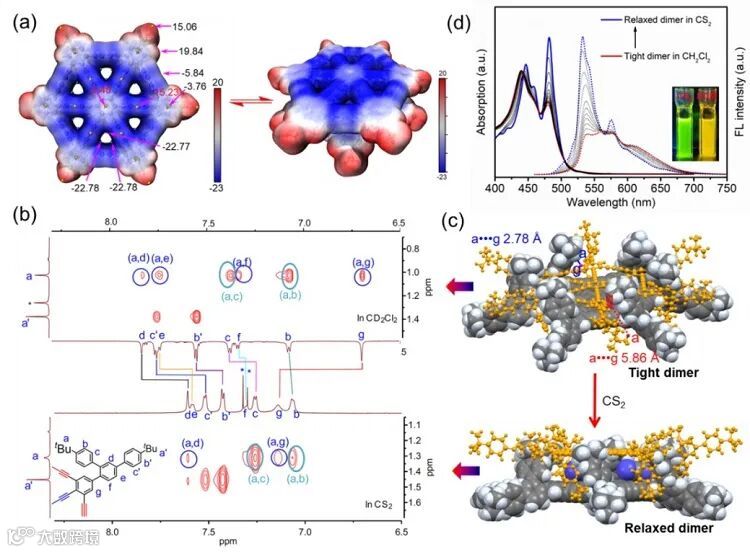 /DCM含量逐渐增加,2D NOE、紫外和荧光光谱证明二聚体变得松弛直至以单分子形成存在(图5b-d)。