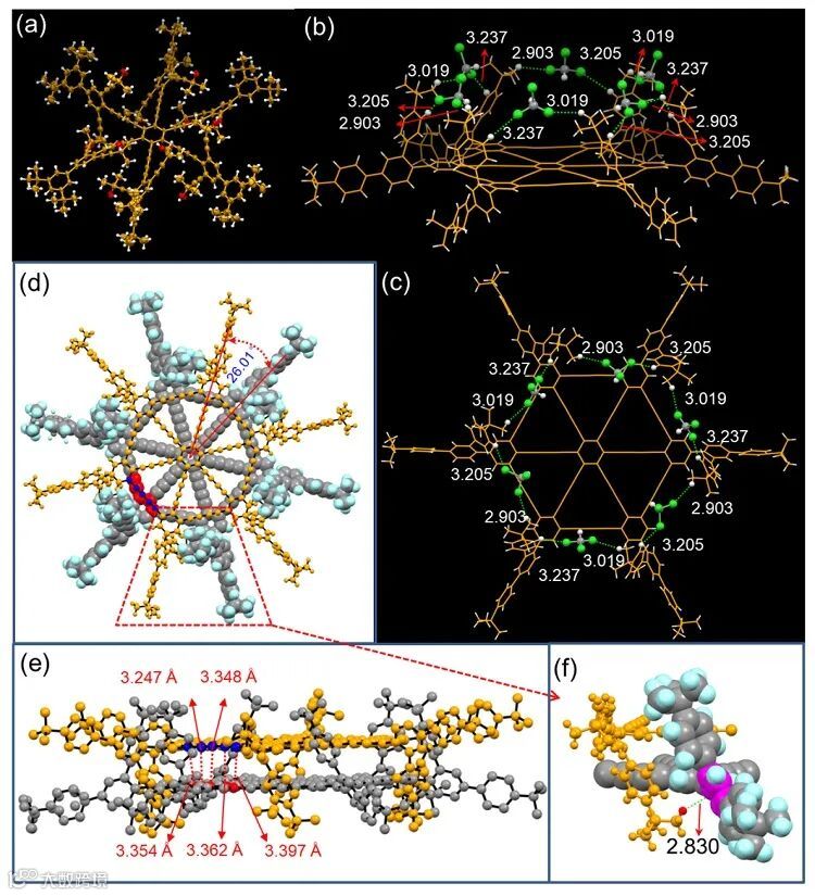 分子间互扣以形成二聚体(图2c, e),其中一分子的叔丁基与另一分子的叔丁基苯环之间存在CH•••π作用(图2f)。相比石墨炔3.6 Å层间距,