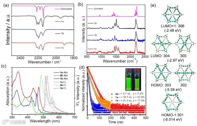 纳米石墨炔红外和拉曼光谱证明结构中存在丰富的苯环和二炔键(图4a, b),两种谱图出峰位置与DFT理论模拟相符。这一系列纳米石墨炔的紫外和荧光光谱图相似(图4c),峰位置整体偏移主要源于周围取代基影响。理论计算