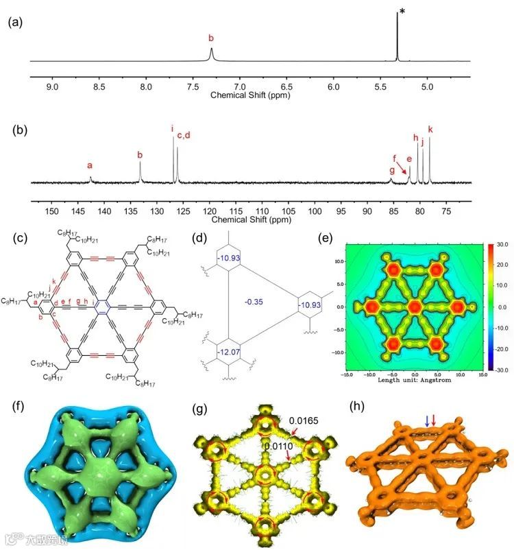 质子和碳的标记;nanoGDY-Me的NICS图(d)、二维 (e) 和三维 (f) ICSSzz图、ACID图 (g) 和LOL-π等值面图(h)。图片来源: