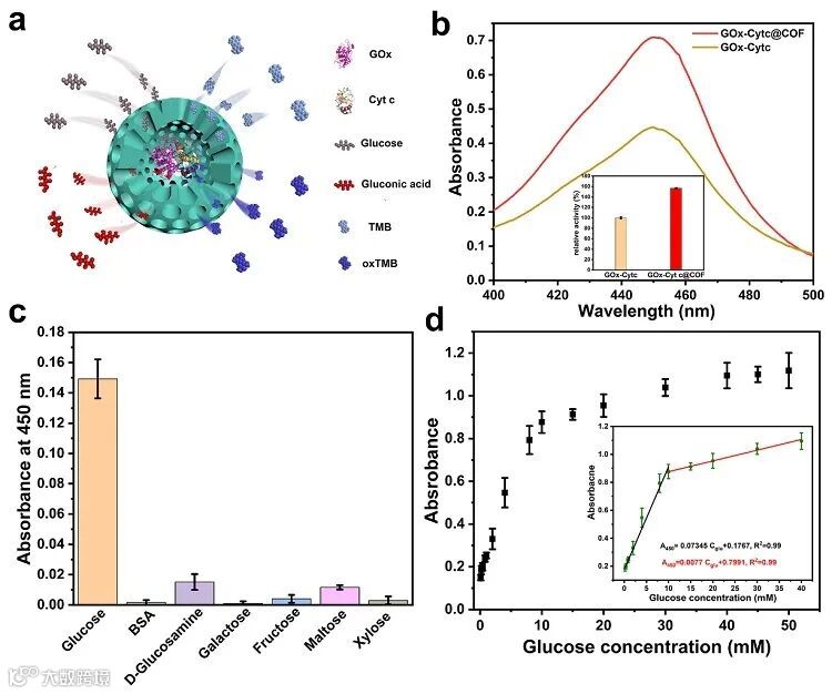 在此基础之上,作者将葡萄糖氧化酶(GOx)和Cyt c共封装于COF胶囊内,成功构建了基于COF胶囊的多酶级联反应系统(GOx-Cyt c@COF,见图3)。与游离GOx和Cyt c相比,所制备的GOx-Cyt c@COF的活性提高了1.6倍。此外,GOx-Cyt c@COF还展现出优异的底物选择性。鉴于其表现出的高的催化活性和优异的选择性,GOx-Cyt c@COF被应用于葡萄糖的比色检测。实验结果表明,与现有方法相比,基于GOx-Cyt c@COF的葡萄糖比色检测方法具有低的检测限和宽的检测范围,展现出令人满意的性能。