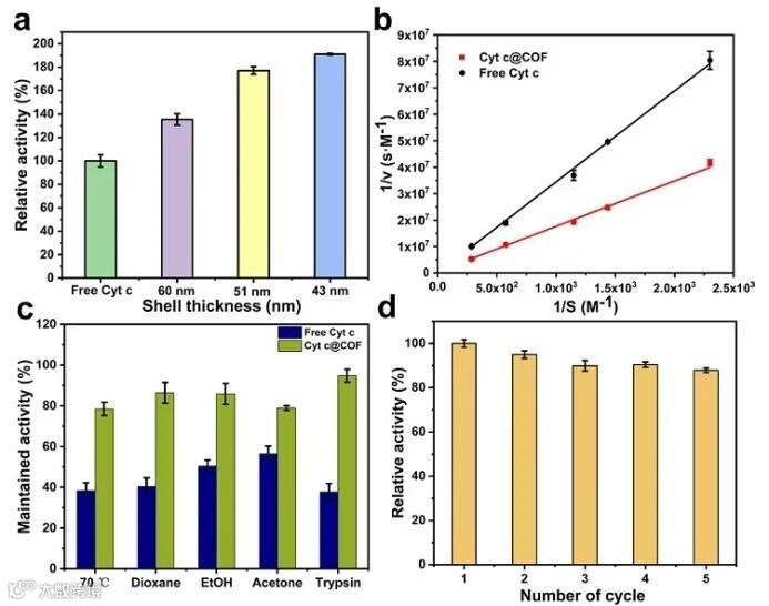 酶活性测试结果显示Cyt c封装在COF胶囊后,其催化活性可提高1.3-1.9倍(见图2)。动力学实验进一步证实Cyt c被封装后,其对底物的亲和力显著提升。对Cyt c活性提高的机制进行探究,发现COF胶囊与Cyt c之间的相互作用导致Cyt c产生了结构扰动,该结构扰动可能提升了Cyt c活性中心对底物的可及性。此外,实验发现Cyt c@COF对高温,有机溶剂和变性剂等不良环境展现出良好的抵抗能力。循环利用实验表明在循环利用5次后,Cyt c@COF仍保留了其初始活性的80%以上。