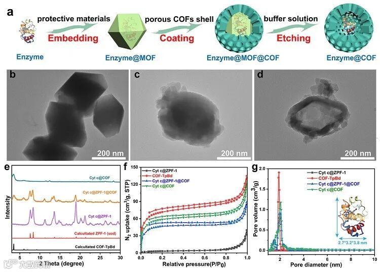 图1. enzyme@COF 胶囊的合成示意图及对Cyt c@COF胶囊的表征