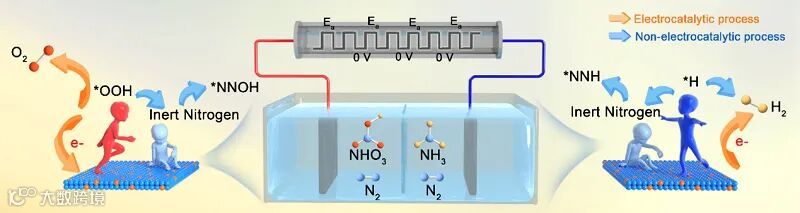 。然而,这两种工艺需要的生产条件都非常苛刻,消耗大量的能源,并且排出大量的温室气体。据统计,每年生产氨和硝酸所需的能耗占化工行业能源消耗的12%,排放温室气体更是高达4.6亿吨。寻求温和、绿色的合成氨和硝酸工艺,实现可持续/分布式循环氮经济,对我国的碳中和战略具有重要意义。电催化固氮反应,利用水和氮气进行的电化学氮气还原反应制备氨气 (NRR) 和氮气氧化反应合成者硝酸 (NOR),可以直接将可再生能源产生的电能转化为易于储存和运输的氨气或者硝酸,并保证二氧化碳的零排放,为解决当前严峻的能源和环境问题提供了新的思路。然而,固氮反应和水裂解副反应间的动力学差异导致催化选择性低、活性差。如何实现高选择性氮气定向转化一直是阻碍该领域发展的重大挑战。
