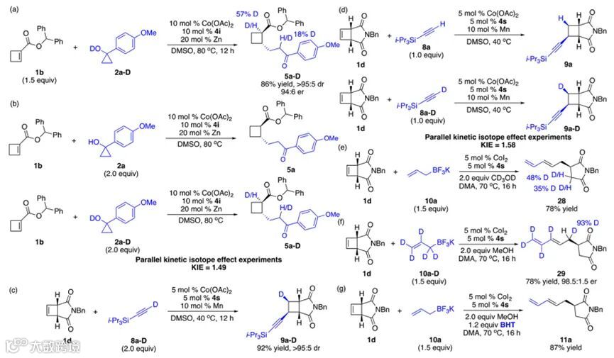 平行动力学实验表明质子转移步可能不是反应的决速步。首先使用了氘代甲醇作为质子源进行反应,产物被氘代的位置为无取代基的羰基α位,两个氢的氘代率分别为48%和35%,其他位置的氢并未发现氘代(图9e)。这可能说明了反应可能涉及烯醇钴物种被质子源淬灭的过程。随后使用全氘代的烯丙基氟硼酸钾作为底物进行反应,除了烯烃上存在氘原子,在烯烃的烯丙位中的两个氢原子也有一个氘代率为93%的氢,而另一个氢的氘代率小于5%(图9f)。添加BHT没有抑制该反应表明反应中可能不包含自由基的历程(图9g)。