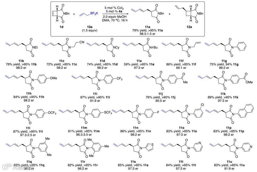 )-BenzP*为配体,甲醇为质子源,DMA为溶剂,在70 ℃下反应16个小时,得到了四元环开环后的共轭二烯产物。对该底物范围进行考察,发现不同烷基、芳基和杂环保护的环丁烯均能高对映选择性得到目标产物(图7)。