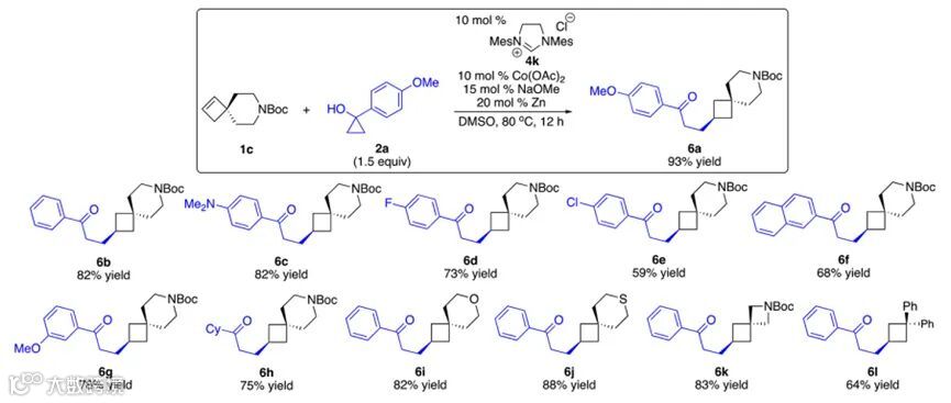 对环丙醇底物范围进行了考察,发现带有强吸电子取代基的环丙醇以较低的收率和立体选择性得到目标产物。而带有供电子取代基的环丙醇则可以取得较好的反应效果。卤素和呋喃环均可以在反应体系中兼容。烯基和烷基取代的环丙醇都能以较高的收率、非对映选择性和对映选择性得到手性环丁烷化合物(图3)。作者也尝试了钴催化环丙醇与含有季碳中心的惰性环丁烯的偶联反应。不同芳基和烷基取代的环丙醇都可以区域专一的得到环丁烷产物。带有杂原子(O,S)的环丁烯也能以82-88%的收率得到产物(图4)。