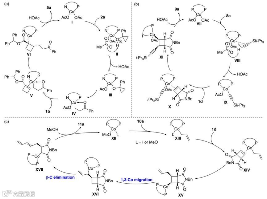 作者提出了该反应的可能的机理:醋酸钴与环丙醇配位后经历分子内脱质子后β-碳消除得到高烯醇钴中间体。该中间体与环丁烯配位后插入再质子化得到手性环丁烷产物(图10a)。醋酸钴与炔烃配位后脱质子得到炔基钴中间体,该中间体与环丁烯配位后插入再质子化得到炔基取代的环丁烷化合物(图10b)。烯丙基钴中间体与环丁烯配位后插入,接着发生1,3-钴迁移、β-碳消除及质子化得到环丁烷开环产物(图10c)。