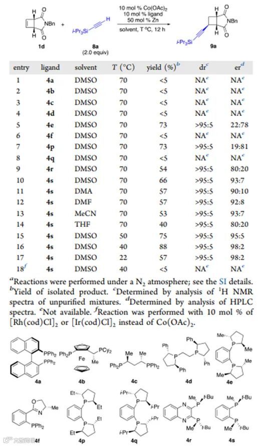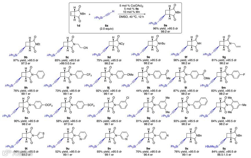 为模板底物对配体、溶剂和温度进行了考察。发现反应在40 ℃下便能高非对映及对映选择性得到炔基取代手性环丁烷产物(图5)。