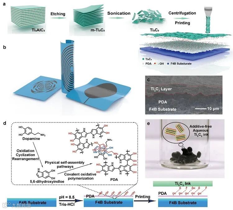 该工作首先将聚多巴胺(PDA)均匀覆盖在柔性介质基板表面,然后利用直写式挤压印刷技术将纯水性