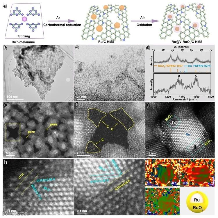 的三聚氰胺前驱体会生成Ru纳米团簇均匀分布的碳基微米片——Ru/C HMS。接下来的低温(200 ℃)氧化过程能够在Ru纳米团簇表层可控覆盖仅有几个原子层的Ru