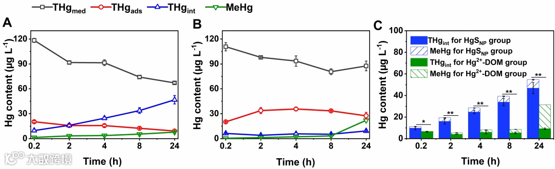 图1. 暴露 HgSNP或者Hg2+-DOM后,细菌各组分汞含量变化。A)暴露 HgSNP(200 μg L-1)后,培养基总汞(THgmed)、细胞吸附总汞(THgads)、胞内总汞(THgint)和甲基汞(MeHg)含量的变化;B)暴露 Hg2+-DOM(200 μg L-1)后,THgmed、THgads、THgint和MeHg含量的变化;C)暴露HgSNP和 Hg2+-DOM后,胞内总汞含量(THgint+MeHg)随时间的变化