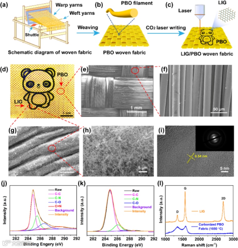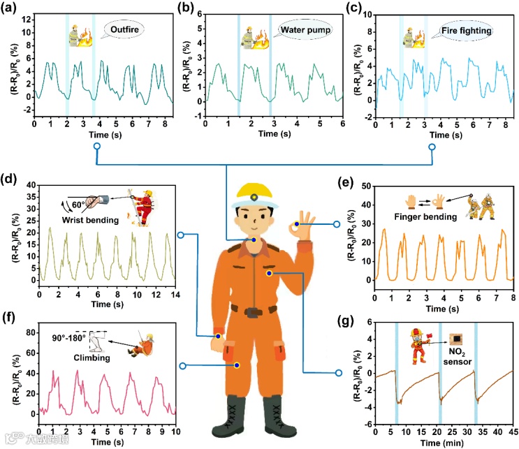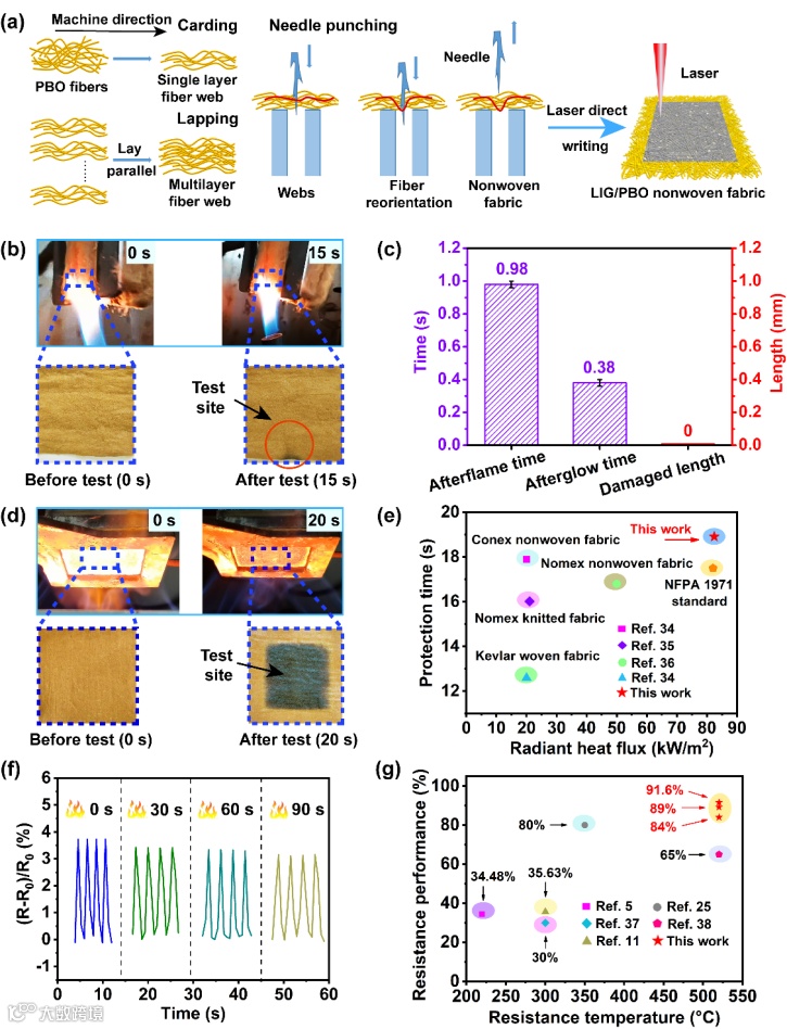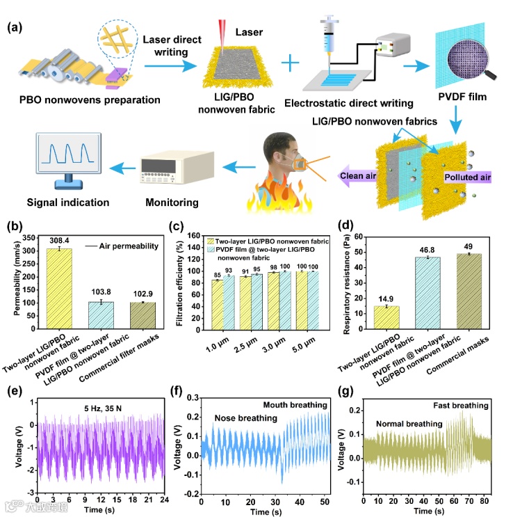 近日,西安工程大学樊威教授团队联合清华大学张莹莹教授团队者通过CO2激光直写法制备了两种Janus石墨烯/聚对苯撑苯并二唑织物(PBO)织物,并将其作为智能消防服和消防面罩的性能进行了评估。获得的Janus石墨烯/PBO织物具有较高的导电性、优良的阻燃性和热防护性能。基于石墨烯/PBO机织物的传感器在人体运动监测和火灾中有毒气体NO2的检测方面表现出良好的可重复性和稳定性。此外,以石墨烯/PBO非织造织物为电极层,以阻燃整理后的PVDF静电直写膜为压电层,制备了智能消防面罩。该面罩表现出舒适的透气性(103.8 mm/s)、良好的烟雾过滤效果(对PM2.5和PM3.0的过滤效率分别达到95%和100%)和较低的呼吸阻力(46.8 Pa)。还可以对人体呼吸的速度和强度敏感,这对于间接反映人体的健康状况至关重要。因此,本工作开发的Janus石墨烯/PBO织物有望在智能消防服饰中获得应用。