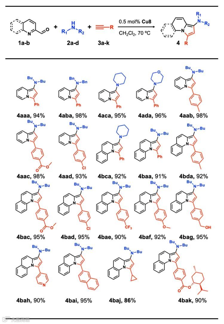 凭借优异的化学稳定性,Cu8被认为是一种很有前途的催化剂。同时,吲哚嗪作为一种药物骨架,在生物领域中具有重要作用。因此,使用Cu8作为催化剂,以2-吡啶甲醛衍生物、仲胺和末端炔烃为原料以较高的收率合成了19种吲哚嗪类化合物,表现出较为广泛的底物适用性。对于模板反应,Cu8的TOF高达3880
