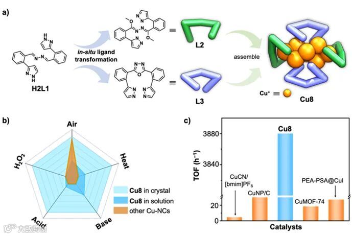 图1. (a) 通过配体原位反应制备原子精确的吡唑基铜纳米团簇(Cu8)的示意图;(b) 评估Cu8和其他铜纳米团簇的化学稳定性的雷达图;(c) 基于Cu8和一些代表性催化剂用于合成吲哚嗪的TOF比较。